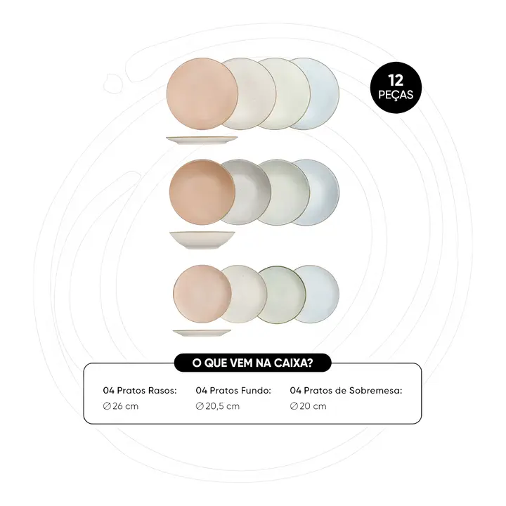 O jogo de 12 peças combina formatos essenciais para refeições completas: pratos rasos generosos, fundos proporcionais para sopas, caldos e massas, e sobremesa com diâmetro ideal para frutas, doces e cafés da tarde. A composição em múltiplas cores permite transformar cada mesa em uma pequena narrativa, alternando combinações conforme o humor da casa ou o momento da refeição.
