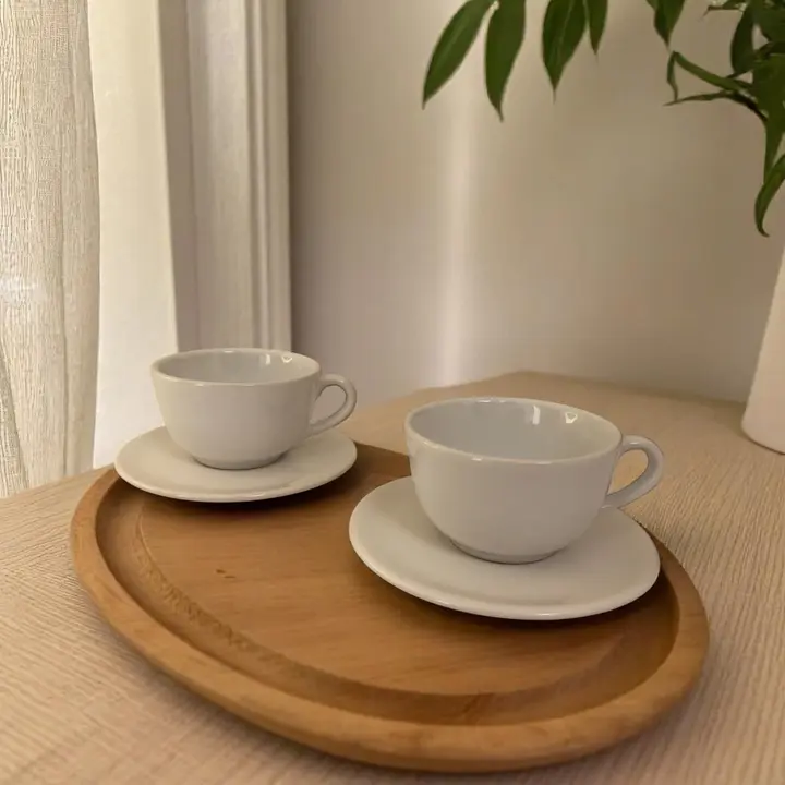 Para um cenário requintado, as xícaras Egg Oxford Unni White se destacam em uma cozinha gourmet com bancadas de mármore branco, armários de acabamento acetinado e eletrodomésticos em aço inoxidável. O conjunto harmoniza perfeitamente com talheres de prata, toalhas de linho e taças de cristal, criando um ambiente sofisticado e elegante.