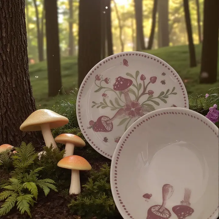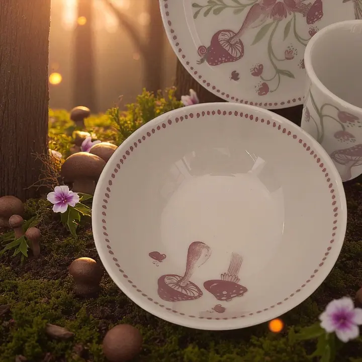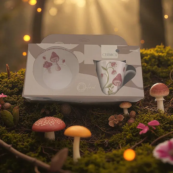 Já no modelo Cogumelos, a inspiração vem das florestas encantadas. Com tons de laranja, vermelho e off-white, o conjunto remete ao lúdico e ao natural. Ideal para quem deseja tornar o café da manhã ou lanche da tarde mais leve, divertido e esteticamente acolhedor, com traços que evocam a infância e o imaginário botânico.
