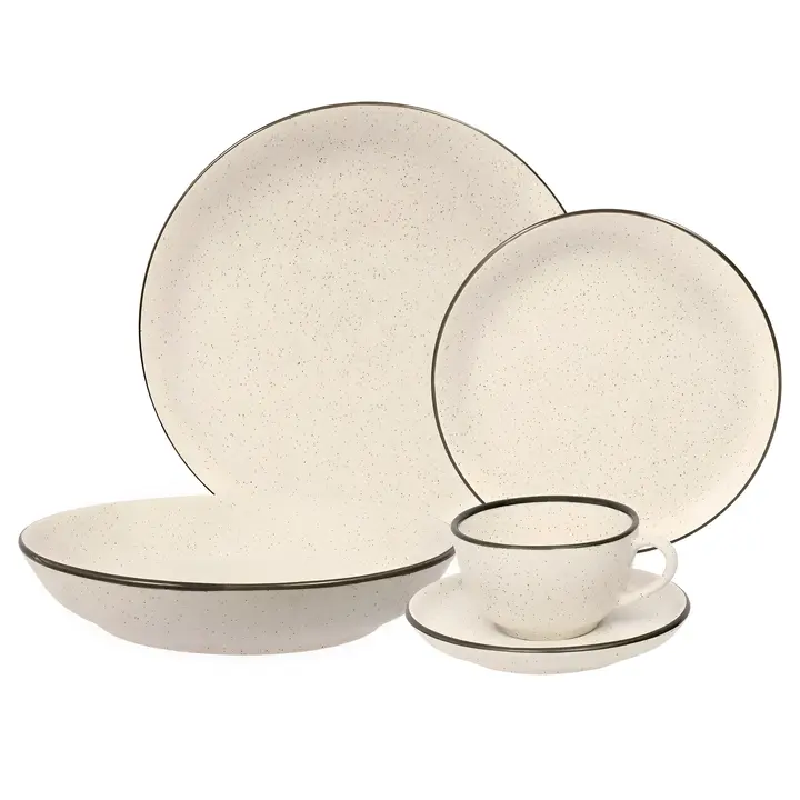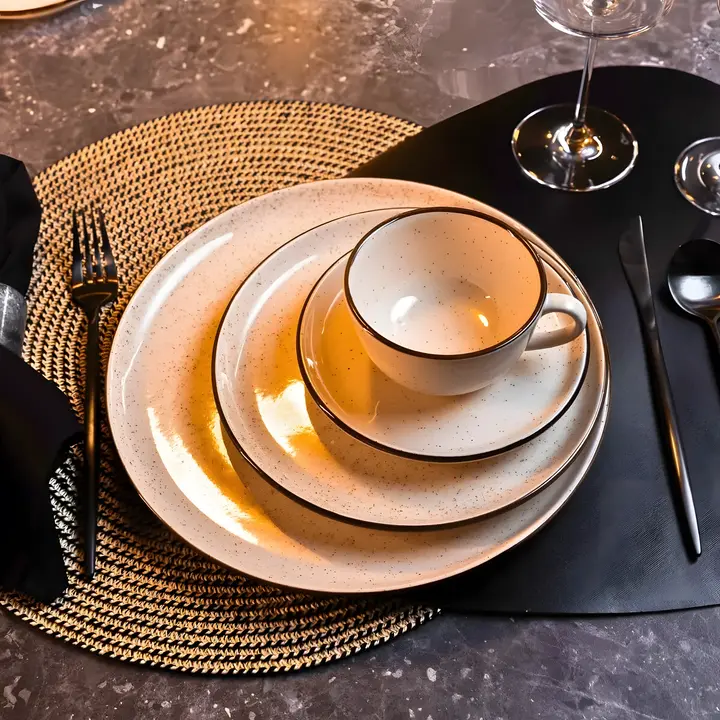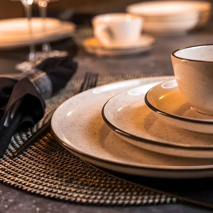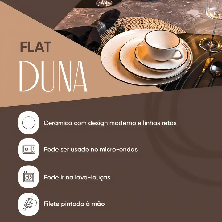 Cada peça reflete o equilíbrio entre linhas retas e formas naturais, resultado do design minimalista da linha Flat, caracterizada por superfícies limpas e acabamento brilhante. As cores neutras – branco, off-white e marrom – remetem à areia e ao contraste suave da natureza, transmitindo paz e requinte visual à mesa.